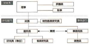 「研究部門」は所長、副所長、研究員、「事務部門」は事務局長(副所長兼務)、事務員で構成されます。研究員は、専任の研究員と客員研究員から構成され、客員研究員は研究上の必要性に応じて学識経験者等にお願いします。