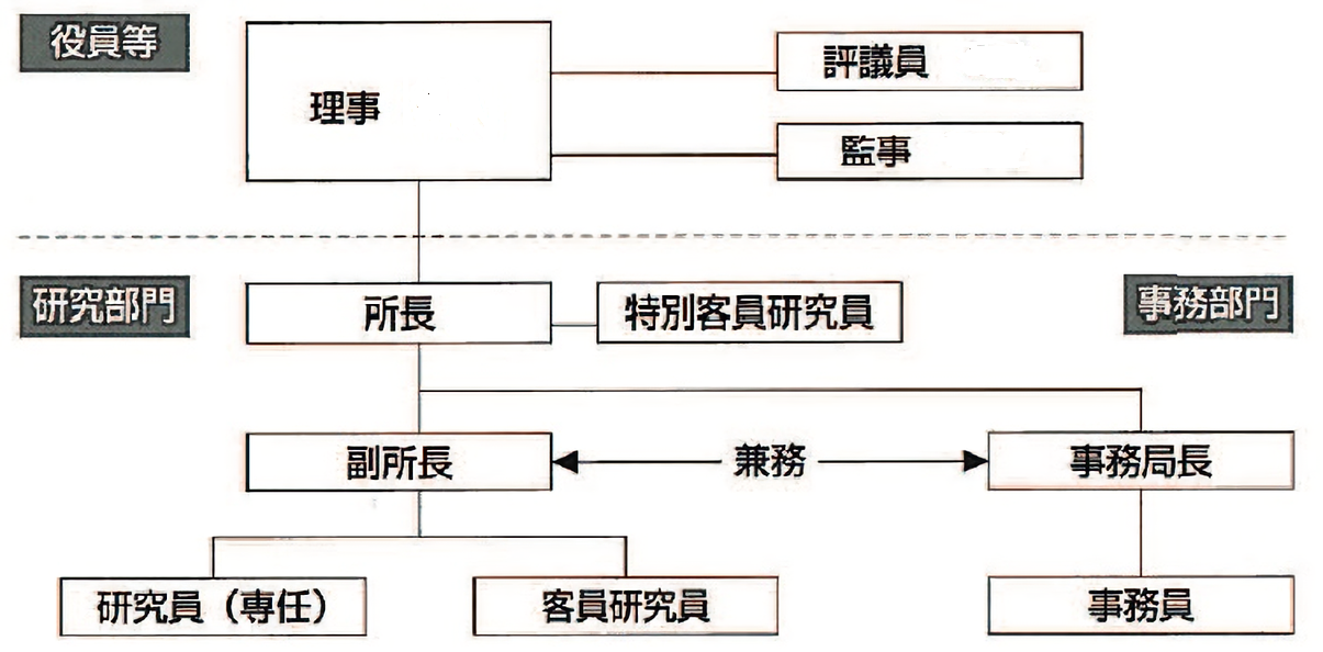 研究所は、「役員等」「研究部門」「事務部門」で構成されます。